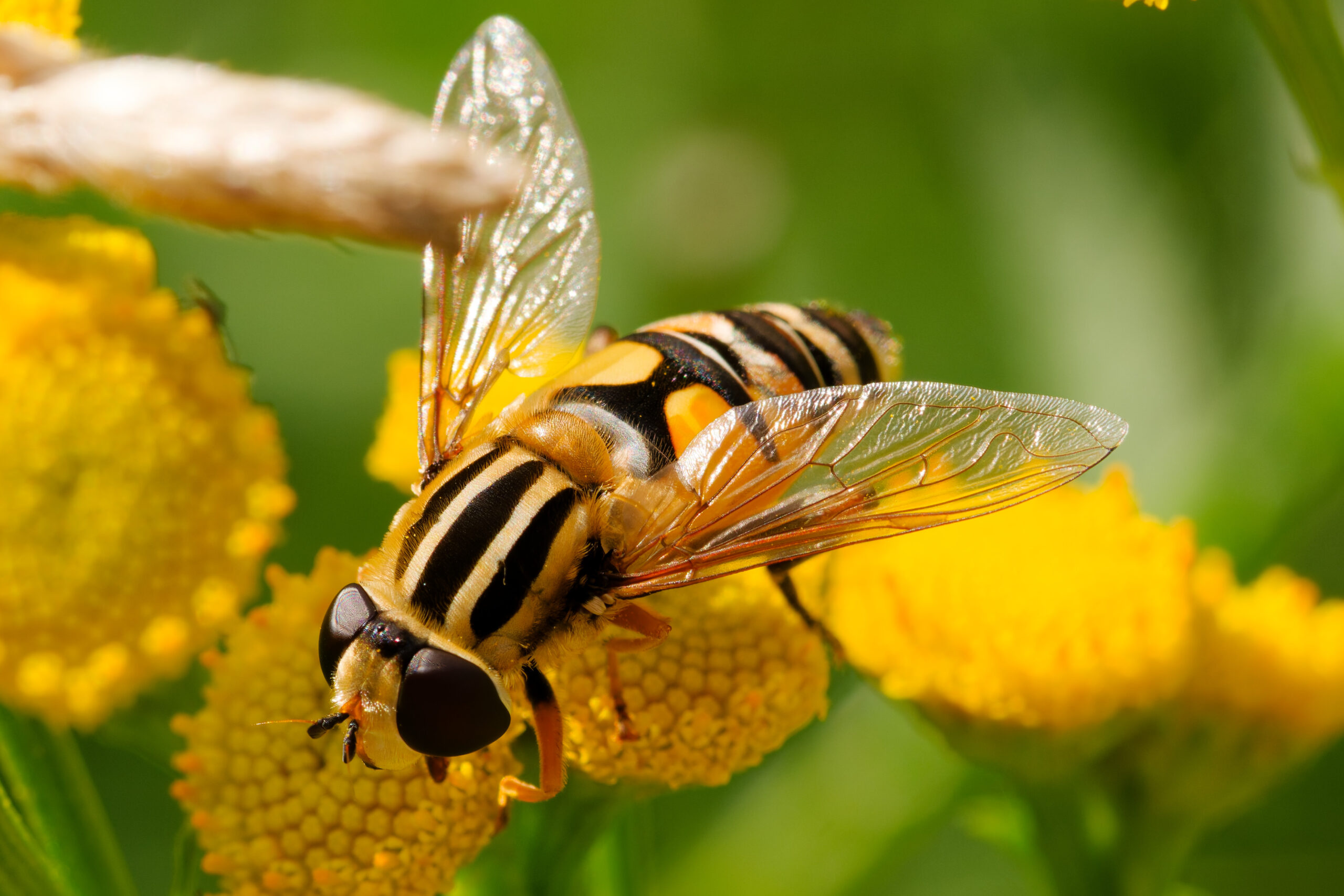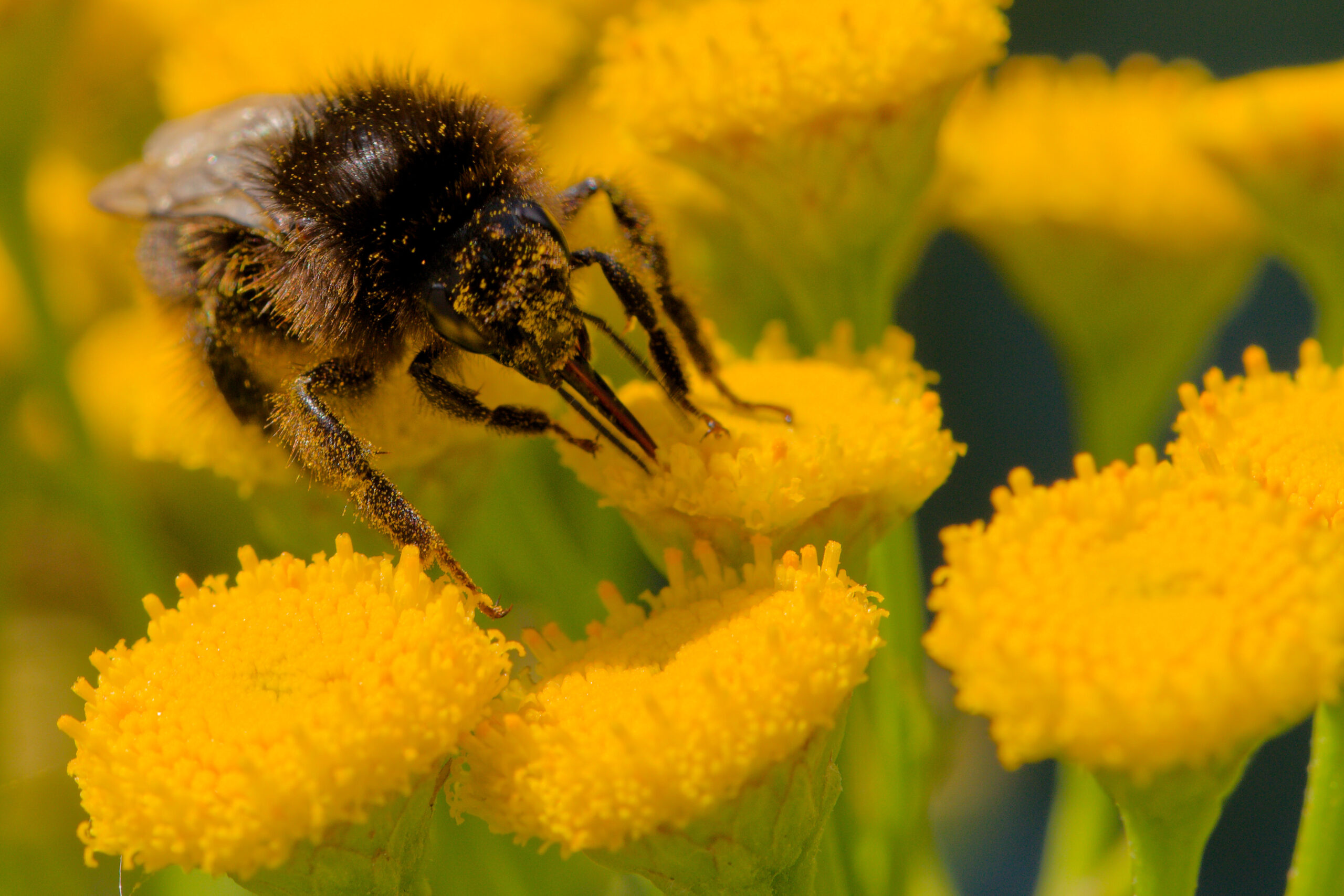 Käytin tässä parin päivän aikana hyväkseni silloin tällöin pilvien takaa esiin tullutta aurinkoa ja kävin työpäivän tauolla ottamassa muutamia testikuvia kukkasilla pörräävistä hyönteisistä.