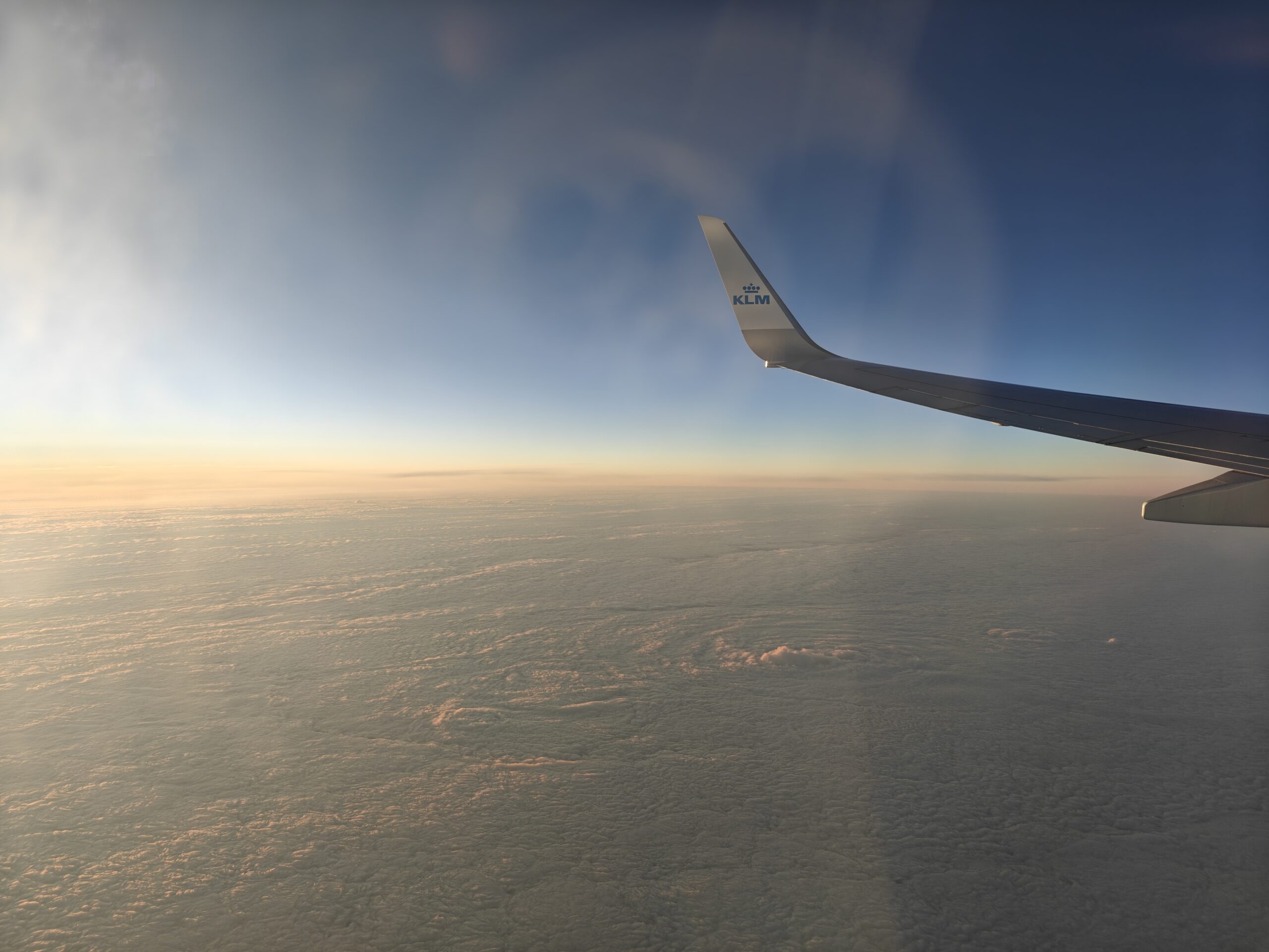 Päästyämme koneeseen, meillä meni hyvä tovi ennen kuin lento pääsi lähtemään. Lopulta kone lähti liikkeelle noin 7:30 ja ajelimme vielä pitkään ympäri kenttää ennen kuin kone kiihdytteli taivaalle. Onneksi meillä on melkein 4 tuntia aikaa Schipholissa, joten puolen tunnin myöhästyminen tämän lennon lähdössä ei pitäisi olla minkäänlainen ongelma seuraavaan koneeseen ehtimisen sunteen.