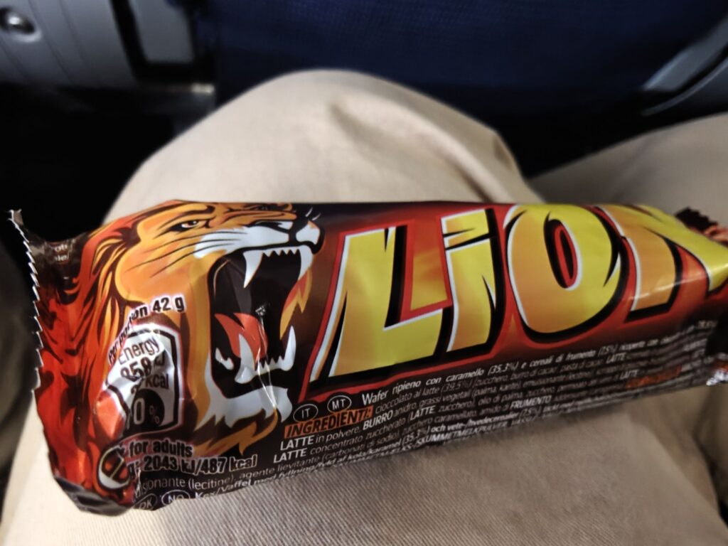 Koneen päästyä taivaalle juhlistimme matkaan pääsyä asiaan kuuluvasti haukkaamalla Leijonapatukat. Ne olikin herkullisempia kuin lennolla tarjottu baanaanileipä. Joten patukoiden hommaaminen eilisellä kauppareissulla oli ihan hyvä idea.
