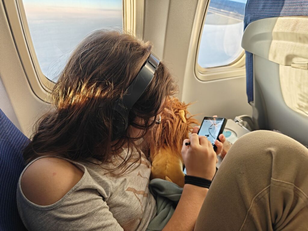 Nyt tässä tapamme aikaa Sofian kanssa kuulokkeet päässä. Sofia piiretee puhelimella ja minä kirjoittelen tätä viestiä. Molemmilla vastamelukuulokkeet päässä poistamassa lentokoneen kohinota korvista, joka toimiikin varsin hyvin. Alkuperäisen aikataulun mukaan meillä oli lähtö 7:00 ja saapuminen Schipholiin 8:35. Amsterdamin ollessa tunnin meitä perässä aikavyöhykeissä, lento on siis noin 2 ja puoli tuntia pitkä. Eli lyhyempi kuin odotteluaika ennen seuraavaa lentoa.
