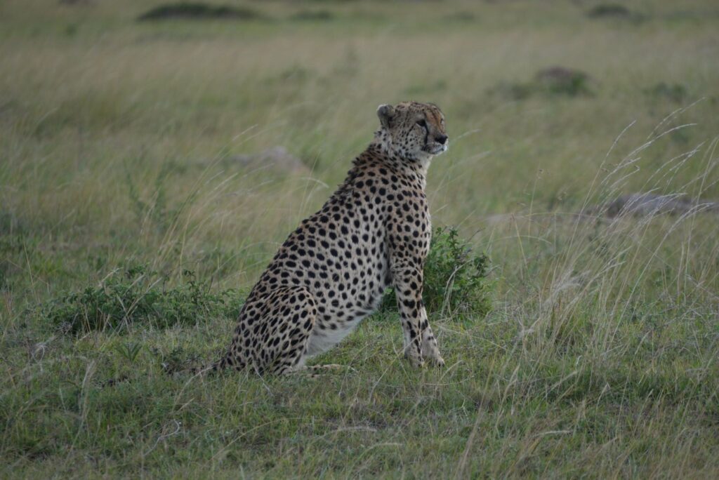 Marassa näytti aluksi aika autiolta eläinten kannalta, mutta maisemat olivat mahtavat. Tällaista avointa savannia emme olleet nähneet vielä kummallakaan edellisellä matkallamme. Pienen ajomatkan jälkeen havaitsimme auton mäen laella. Koska siinä ei ollut katto ylhäällä, oletimme sen olevan riistanvartijoiden auto. Kuskimme ajeli sen luokse, koska siellä kenties olisi jotain näkemisen arvoista. Eikä meidän tarvinnut pettyä. Siellähän ajouran reunassa loikoi gepardi. Pääsimme sitä rauhassa kuvailemaan, koska mitään muita autoja ei paikalla ollut. Gepardi oli vielä oikein huomaavainen meitä kohtaan ja nousi istumaan, jotta saimme siitä oikein hyviä kuvia.