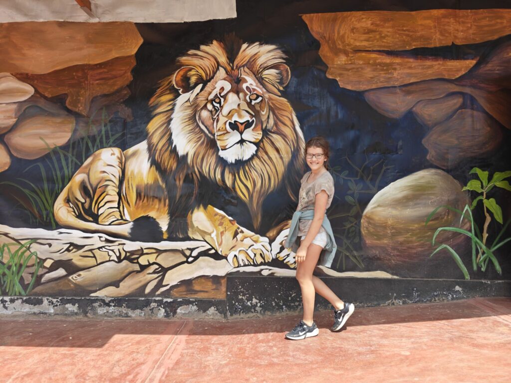 Parin tunnin ajomatkan jälkeen pysähdyimme jaloittelemaan matkamuistomyymälään, jossa oli aika komeita maalauksia etuseinässä ja hieno leijona-aiheinen puuveistos myöskin.
