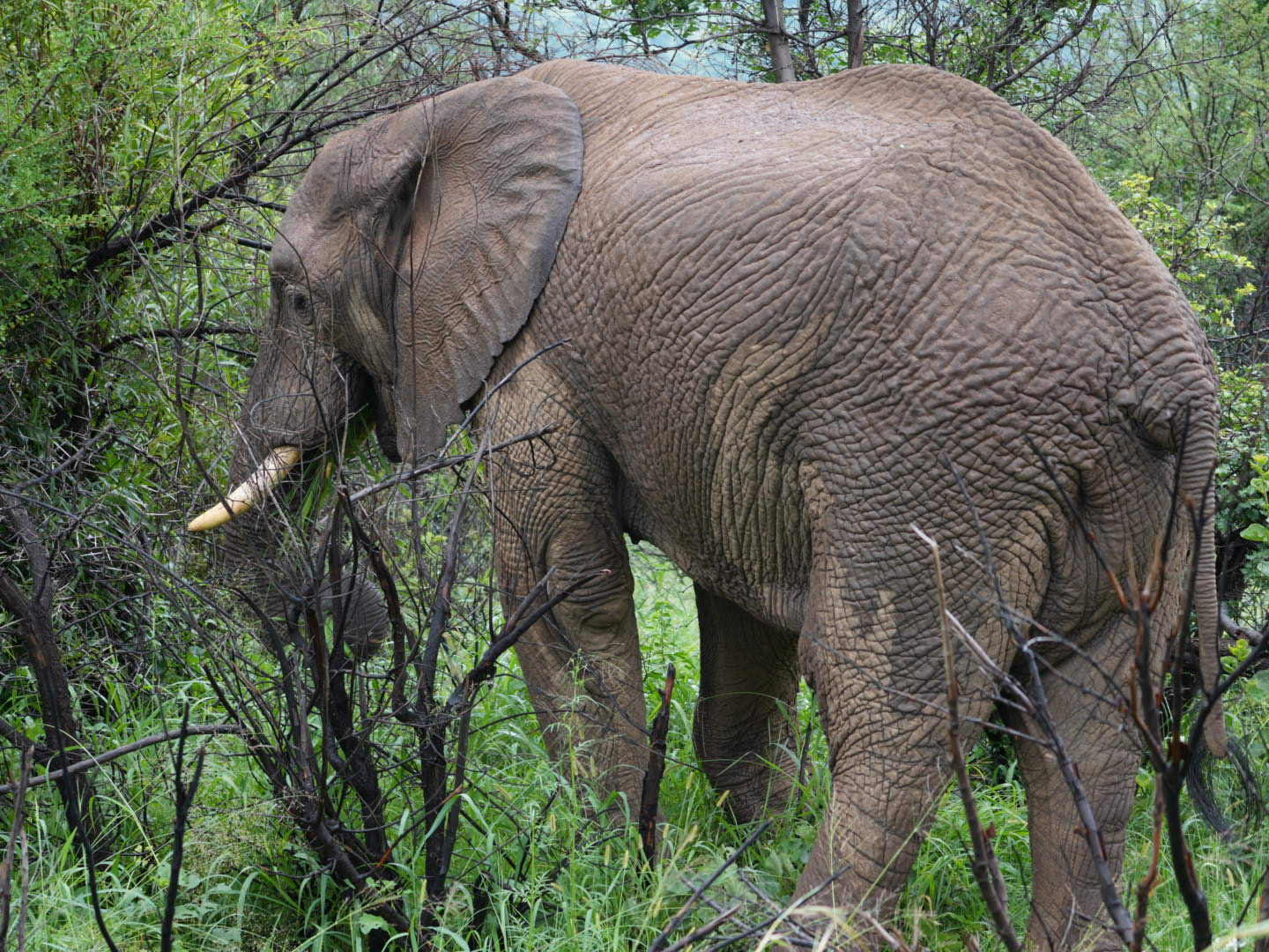 Aluksi näimme vain tuttua kalustoa, eli impaloita, seeproja ja gnuita. Muutama harvinaisempikin tuli vastaan: Punainen lehmäantilooppi ja tsessebe (sassabiantilooppi). Jonkin aikaa ajeltuamme, big fiven keräily edistyi: Näimme norsuja. Ensin kaukaa, mutta pian tulimme paikkaan missä yksi norsu oli aivan tien laidassa. Sen verran lähelle pääsimme, että koko norsua en saanut mahtumaan kuvaan zoomi-objektiivillani, vaikka zoomin väänsin ihan minimiin.