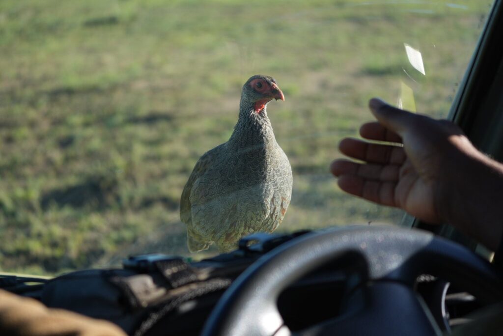 Yhden pysähdyksen aikana saimme salamatkustajia autoomme. Pari punakurkkufrankoliinia lennähti automme päälle. Toinen keulalle ja toinen avonaisen katon reunalle. Katolle mennyt lintu ei sieltä meinannut lähteä, vaikka lähdimme liikkeelle. Siellä se vaan kujerteli, kunnes kuski kävi sen aika lempeästi hätistämässä pois.