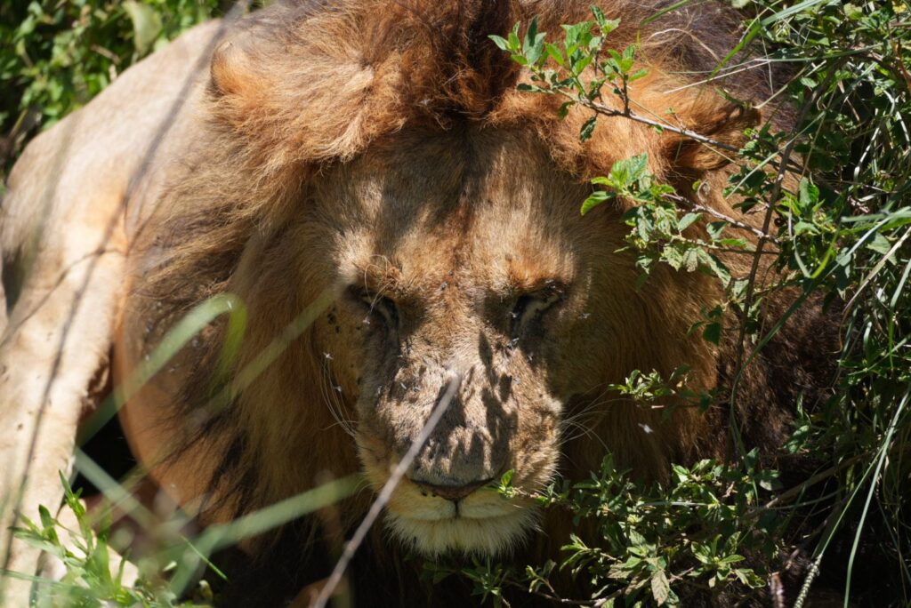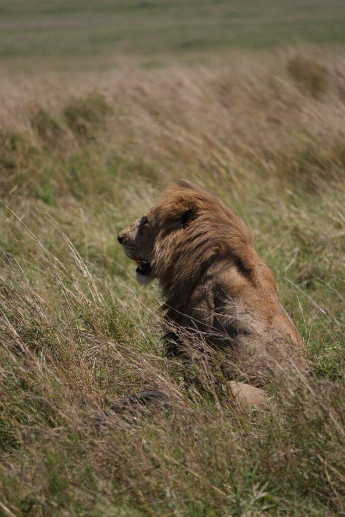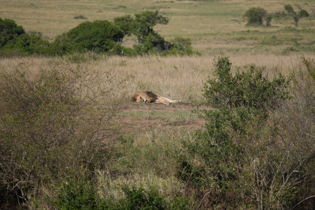 Gnu & seepra paljoutta aikamme katseltuamme, jatkoimme tietä pitkin eteenpäin toisen oppaan vinkin perusteella… Ja vähän ajan kuluttua löysimmekin leijona uroksen makailemassa ojan pohjalta. Kysessä ei ollut mikään laitapuolen kulkija, vaan leijonat tykkäävät köllötellä syvennyksessä, jossa niillä on varjoita ja kylmä & kostea maa helpottaa muutenkin oloa.