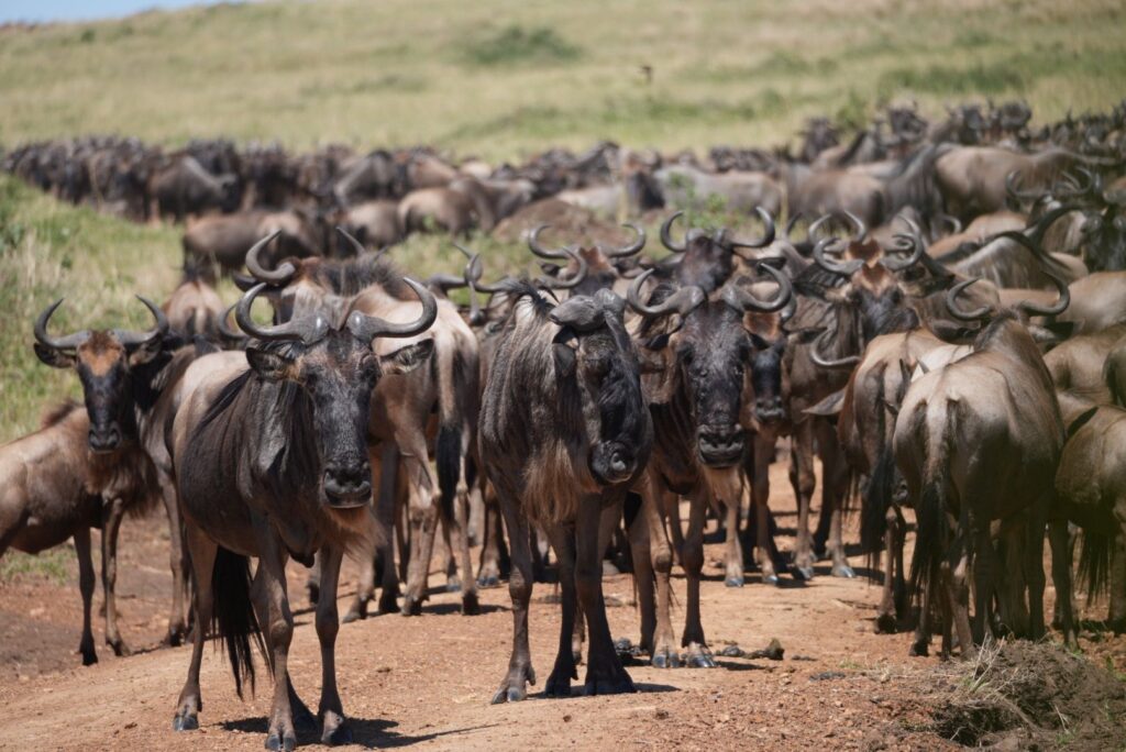 Leijonaa tarkkaillessamme paikalle alkoi saapua seeproja pitkänä nauhana. Koska leijona ei mitään erityisempää ohjelmaa näyttänyt meille tarjoavan, siirryimme vähän eteenpäin suuntaan josta seerat valuivat. Siellä vastaan tulikin melkoiset määrät gnuita. Tämä oli nyt niitä suurten laumojen rippeitä, jotka seuraavat aiemmin Serengetin eteläosia kohti suunnistanutta laumojen pääjoukkiota. Todella karkean arvion perusteella laumassa täytyi olla vähintään 500 yksilöä, todennäköisemmin lähemmäs tuhat. Joka tapauksessa, paljon niitä todellakin oli. Näitä olin halunnut päästä näkemään, joten leijonien kanssa aika onnistunut päivä jo tähän mennessä.