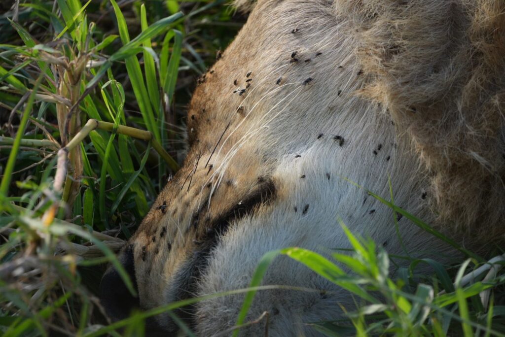 Ennen pitkää näimme auton pysähtyneenä polulle ja kukkulan laella oliki heidän kuvattavanaan kolme leijona naarasta. Niitä aikamme kuvia otettuamme ja niitä kiikaroituamme siirryimme vähän parempaan paikkaan ja sieltä paljastui, että seuraamamme auto oli vähän matkan päässä tarkkailemassa tien toista puolta. Muutaman kuvan toisesta kulmasta otettuamme, menimmekin lähemmäs. Siellähän olikin urosleijona jonkin saaliin kanssa heinikossa loikomassa. Seurailimme hyvän tovin kun pari vaippasakaalia yritti päästä ryöstämään muutaman makupalan leijonan vahtimasta saaliista.