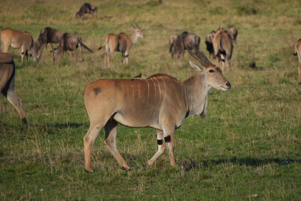 Toiset hienot eläimet tällä kierrroksella olivat elandit. Niitä oli iso joukko gnuiden ja seeprojen keskellä ja kerrankin pääsimme näkemään melko läheltä näitä aika säikkyjä jätti-antilooppeja.