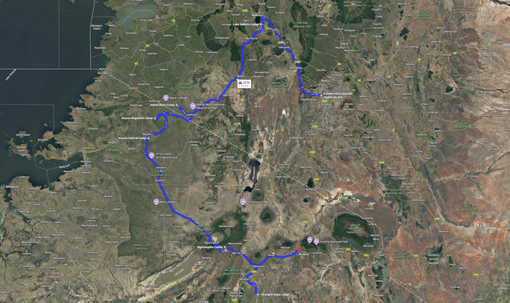 Google Mapsin mukaan siirtymiin kuluu aikaa yhteensä noin 25 tuntia ja kuljemme yli 1000km. Joka ei loppujen lopuksi ole kovin pitkä matka, suunnilleen Suomi päästä päähän. Senhän ajaa aika helposti päivässä tai parissa. Tässä tapauksessa suuri osa matkaan ei tietenkään ole verrattain hyväkuntoista asfalttitietä, jossa voi huoletta posottaa noin 100 kmh. Kun reittiä katselee tarkemmin, huomaa että varsin suuren osan siirtymistä tulemme tekemään Serengeti-Mara alueen sisällä. Eli siirtymät tulevat käytännössä olemaan safariajoa nekin. Nopeus moisessa ajossa onkin sitten aika verkkaista, koska koitamme samalla bongata eläimiä ja niitä kun näkyy, pysähdymme niitä tarkkailemaan ja kuvaamaan. Olettaisin että tietkin ovat maasturille sopivia hiekkateitä. En tosin ole ihmeissäni, jos Serengetissä on jopa jonkin verran asfaltoitua tietä tiheimmin liikennöidyillä safarireiteillä.