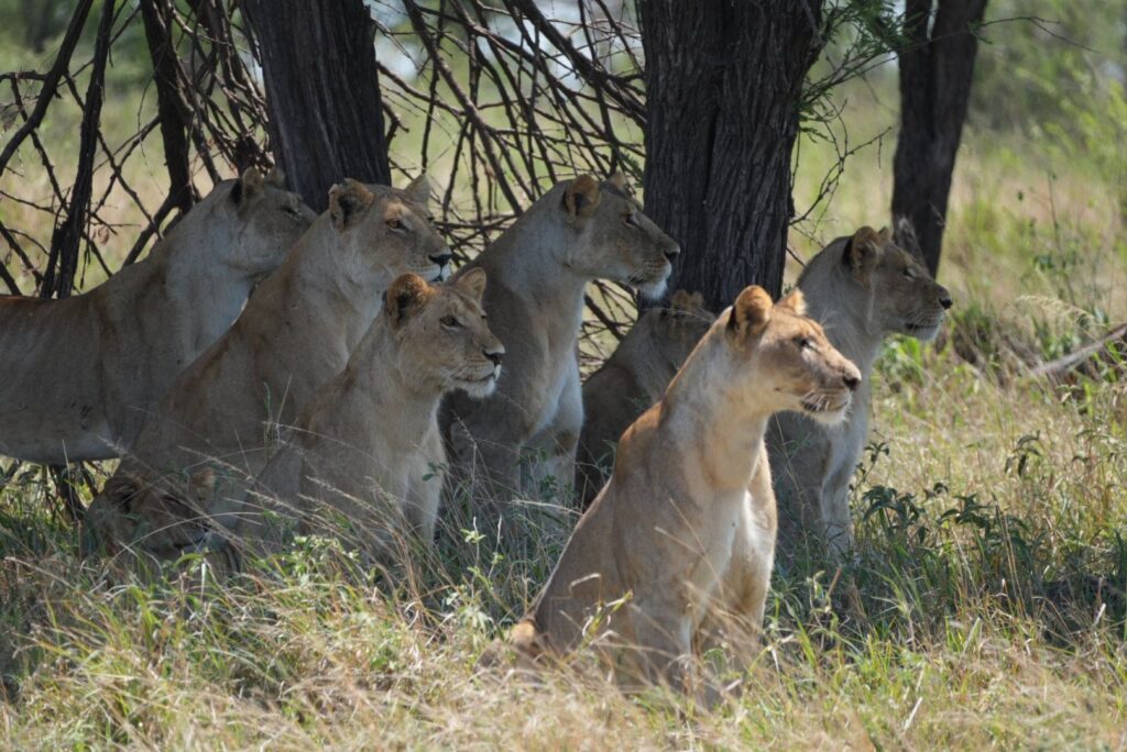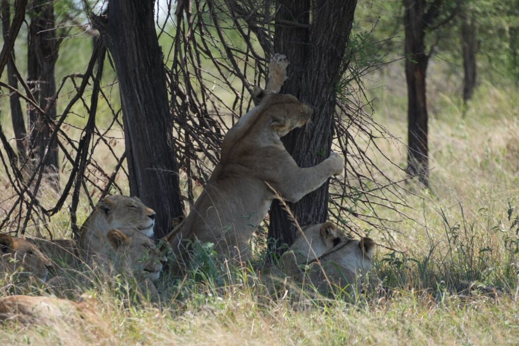 Jatkoimme matkaa melko tohkeissamme näkemästämme laumasta, eikä Sofiankaan mielestä Serengeti ollut enää kovin tylsä paikka. Ja vähän ajan kuluttua vastaan tuli taas rypäs autoja tien laidassa ja mitäpä siellä muuta olisi ollut, kuin toinen leijonaluma. Puun alla näytti olevan 7 naarasleijonaa kyttäämässä mäen alla kulkevia gnuita. Jonkin ajan kuluttua huomasimme, että itse asiassa jonkin matkan päässä alamäessä oli vielä yksi leijona lisää. Tämä etujoukon leijona itse asiassa lähti hiipimään gnuita kohti, jolloin kuljettajalle tuli kiire siirtää meidän alemmas. Eipä näyttänyt naaraalla olleen onni matkassa ja löysimme sen tien toiselta puolelta huilailemassa.