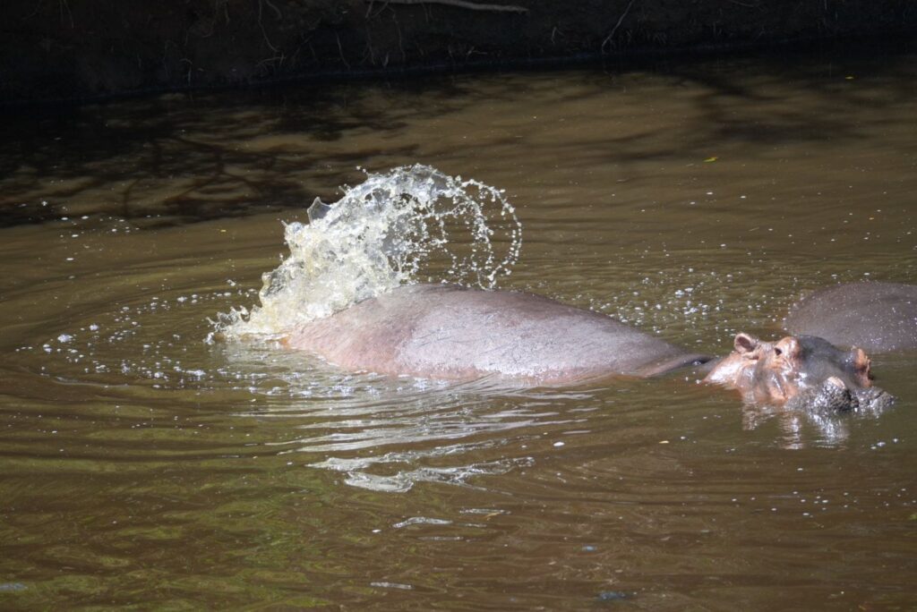 Mentiin sitten parilla laumalla ohi Keniassa nähdyistä leijonista (27 vs 22). Seuraavaksi jatkettiin eläimien etsintää joen rantamilta, mutta paljon mitään ei löytynyt. Ennen kuin päästiin virtahepojen suosimaan joen mutkaan. Hepoja röhnötti joessa iso kasa ja autokuntamme oli aika samaa mieltä minun kanssani siitä, että näystä tuli mieleen siskonmakkarakeitto, kun hippoista näkyi yleensä vain niiden selät veden pinnalla. Siskonmakkaroista poiketen virtahevot roiskivan hännillään sellilleen vettä vilvoittaakseen niitä paahtavassa auringossa. Säätiedotteen mukaan Serengetiin oli luvattu pilvistä. Joo olihan niitä pilviä taivaalla, laskimme 5 pientä pilveä…
