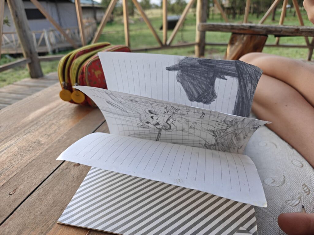 Koska Acasian Central Camp on teoriassa siirrettävä ”leiri”, siinä ei ole uima-allasta. Tämä oli aika ikävä pettymys kuuman autossa vietetyn päivän jälkeen. Viile suihku auttui kyllä kummasti ja tulipa tehtyä vähemmän harrastettuja juttuja huoneella illallista odotellessa. Tai no, minulla aika kului melko pitkälle kuvien valintaan ja siirtelyyn kamerasta ja tämän viestin kirjoittamiseen, mutta Sofia alkoi piirtelemään ottamalla kuviamme malliksi.