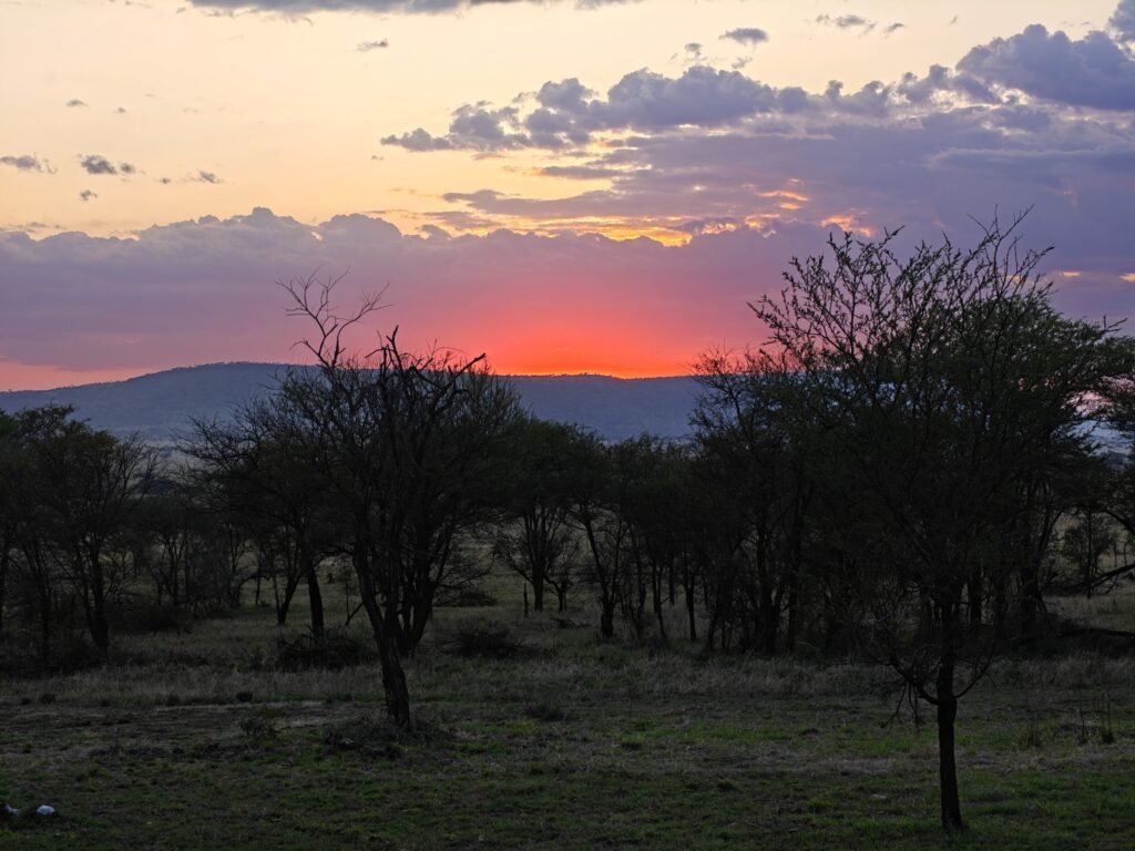 Kirjoittelin nämä tarinat telttamme terassilla olevalla sohvalla istuskellen ja alemmaksi savannin yllä hivuttautuvaa aurinkoa katsellen. Siellä täällä näköyhteyden päässä näkyy silloin tällöin seeproja ja terassimme edessä on myös sellainen kasa kakkaa, että arvelemme seeprojen välillä käyvän aika lähellä telttoja. Tässäkään leirissä ei ole mitään aitoja alueen ympärillä, joten jos pimeällä mennään minnekään, pitää taas radiopuhelimella huhuilla ”taluttaja” paikalle (taluttaja oli Sofian käyttämä termi).