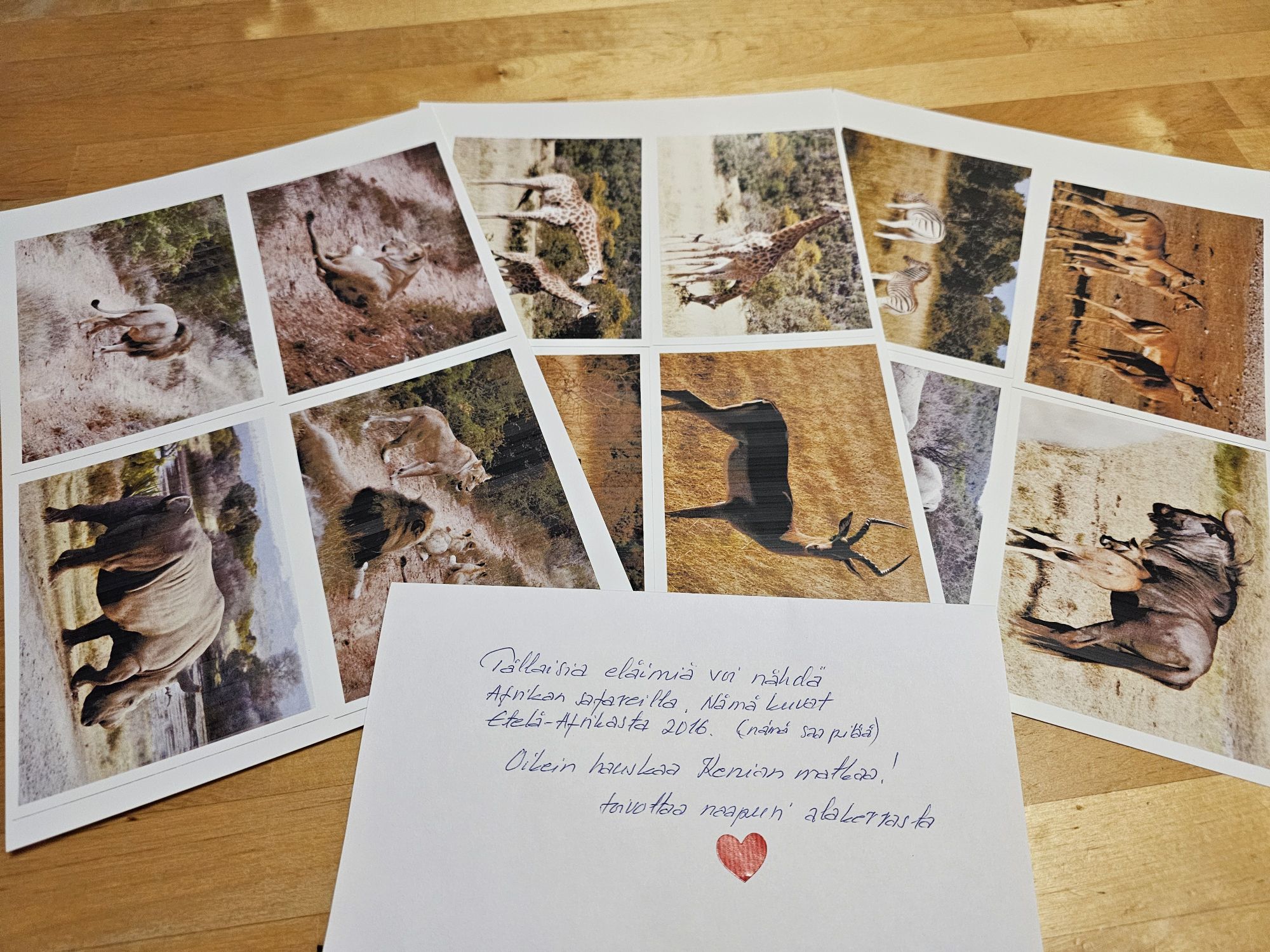Eilen ulos lähtiessäni meidän ovenkahvassa roikkui mukava yllätys. Pussista löytyi salaperäinen kirjekuori, josta paljastui 3 arkkia valokuvia. Nämä ovat peräsin naapurilta, jonka kanssa tuli juteltua tulevasta matkastamme. Hän on käynyt useamman kerran afrikassa ja tietenkin niiltä matkoilta oli valokuviakin otettu. Näiden kuvien perusteella savannin eläimet eivät välttämättä mitään linssiludeja ole, koska useimmat tarjoavat takapuoltaan kameralle… Tai ehkä se on heidän mielestään heidän edustavin puolensa…