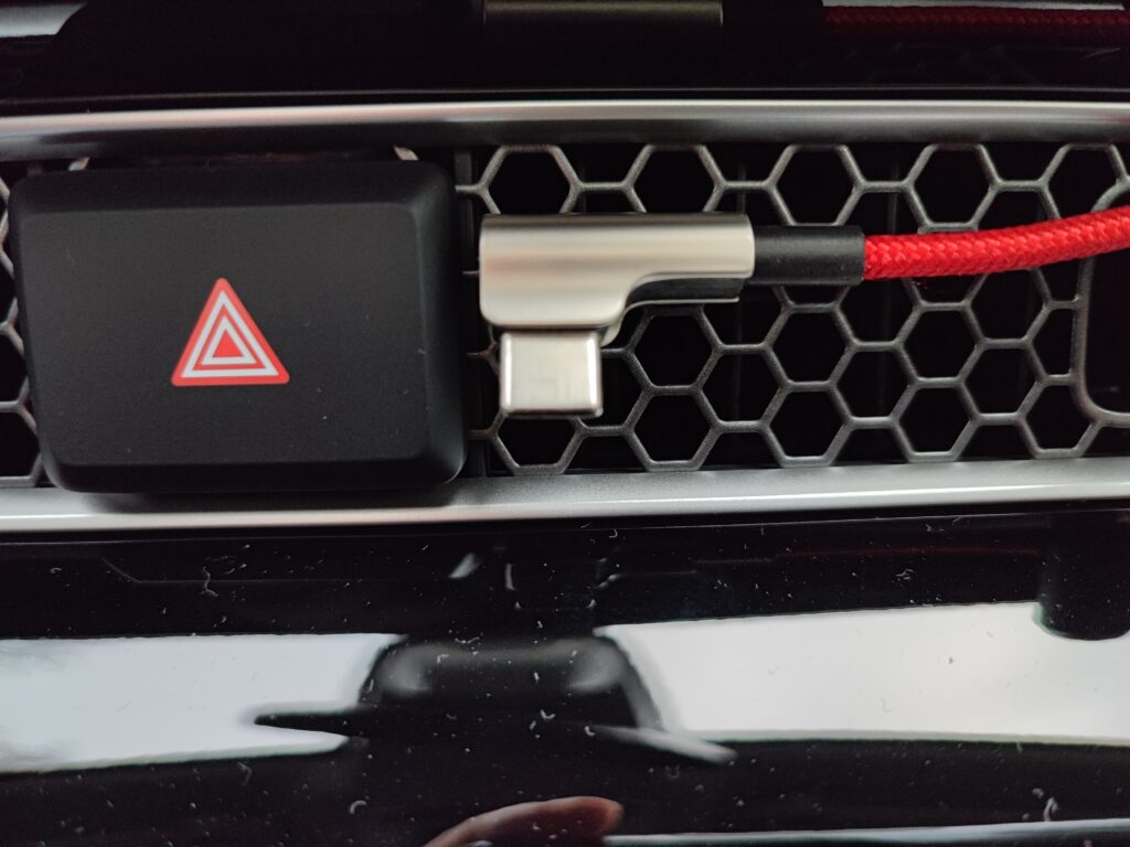 Tässä kohtaa mentiin vähän heikompaan suuntaan vanhasta versiosta. Tai no, riippuu puhelimesta. Oma 6.7″ ruudulla varustettu luuri mahtuu just ja just latausalustalle… Puhelin ei vaan tue langatonta latausta, joten laitan puhelimen kiinni USB-piuhalla. Silloin ei vaan puhelin enää mahdukaan nätisti alustalle johdon kanssa. Kyllä se sinne koloon menee niin, ettei puhelin pääse heilumaan, joten ei mikään isompi ongelma, mutta pitänee ottaa huomioon, kun seuraavan kerran puhelinta vaihdan. USB-kaapelin liitin on L-mallinen ja siten melko kompaktia kokoa, eli tässä ei ole paljon enää pienentämisen varaa.