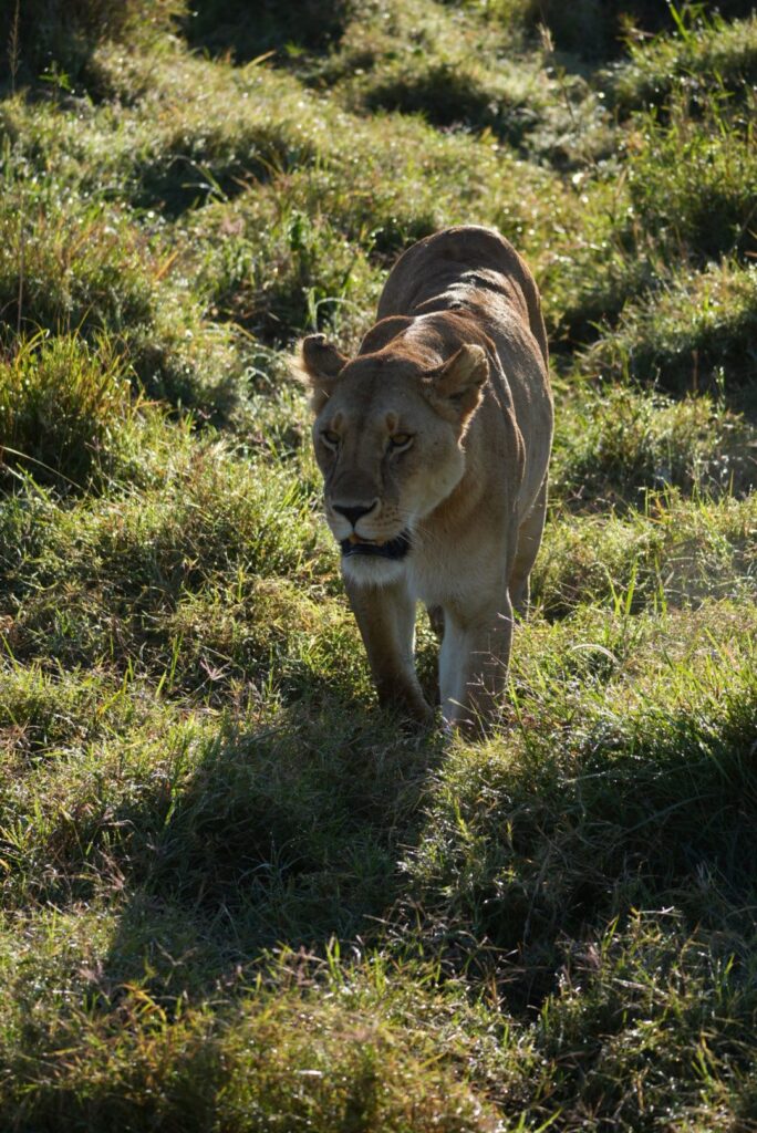 Tietenkin leijonien takia meidän piti pysähtyä. Satuimme paikalle, kun naarasleijona käpytteli tietä kohti ja kun parkkeerasimme sitä katsomaan ja kuvaamaan, niin se käveli tien yli ihan automme nokan editse.
