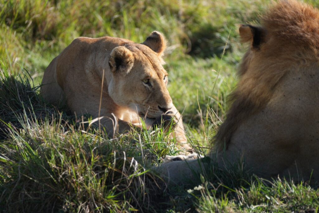 Edellisten jälkeen tien reunalla oli vielä nuori uros naarasleijonan kanssa. Opaamme kutsui niitä häämatkalaisiksi, mutta vaikka muutaman minuutin verran niitä jäimme katselemaan, emme päässeet näkemään parittelua. Harmillisesti meidän kiire aikataulu esti tänä aamuna pidemmän pysähdysen nuoren parin puuhien tarkkailuun.