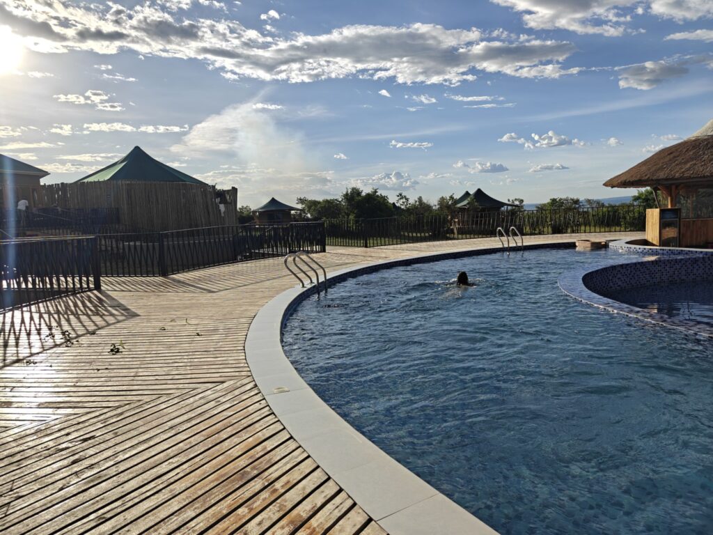 Sofian jatkaessa pulikointia altaassa juttelin henkilökunnan kanssa ensin pyykkien hoitamisesta ja sitten vähän näköaloista. Altaalta näkyy hienosti alemmalle savannille ja sain kuulla, että toisella reunalla ennen vuoria on Kenia ja Marajoki. Eli olimme käytännössä ajelleet koko päivän kestävän kierroksen, päästäksemme näköetäisyydelle edellisestä lodgestamme.