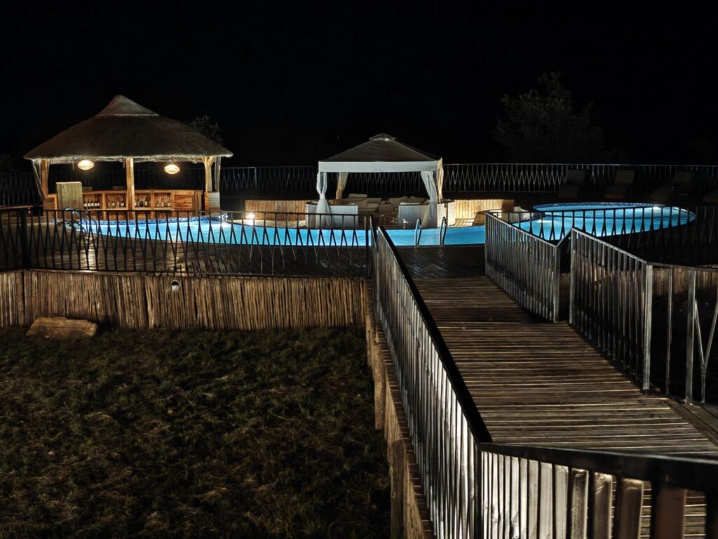 Kuten yllä selvisi lodgella on uima-allas ja huoneet ovat täälläkin ”telttoja”. Tässä kohtaa sanan ympärillä on todellakin isot lainausmerkit, koska huoneissa on telttaa käytännössä vain katto ja vähän vessa/suihkutilan seinistä. Itse asisassa, ottaisin mielelläni huoneeseen ihan normaalin katon, koska tämän telttavirityksen kiinnikkeet narisivat melkoisesti yöllä pikku tuulessa. Sen verran niistä lähti ääntä, että kaikki aitaamattoman alueen savaniin äänet olivat huomattavasti hiljaisempia. Yön aikana kuului ainakin seepran ja hyeenan ääniä, kuten tietenkin paljon sirkkojen ja lintujen ääntelyä. Aitaamattomuuden huono puoli on se, että halutessaan pimeällä huoneeseen tai siitä pois, pitää mukana olla aina saattaja.