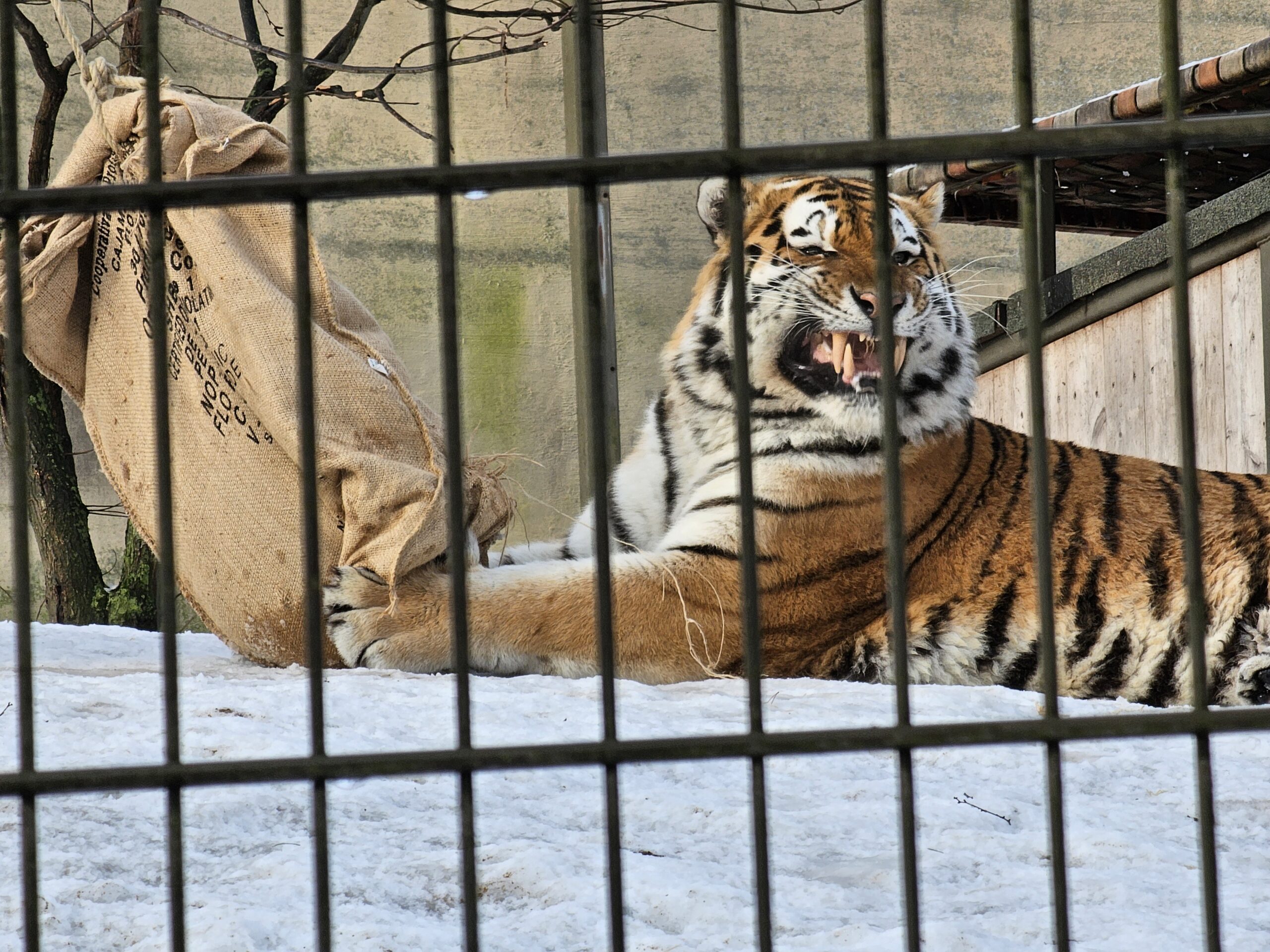 Kellon alkaessa lähestyä kahtatoista, lähdimme takaisin Kissalaaksoon katsomaan tiikereiden ruokintaa. Pientä hidastusta aiheutti se, että huomasimme naaraleijonan loikoilemassa aitauksessa. Se oli sen verran kaukana, että tässä kohtaa kiikareista oli tosi paljon hyötyä. Tiikereiden aitaukselle saapuessamme uros olikin jo lihasäkin kimpussa. Ketjuun kiinnitettyyn vahvassa säkissä oli lihaa, jonka tiikeri saisi syötäväksi vasta kun se saa säkin rikki. Melkoista puremista, repimistä ja vetämistä säkki kyllä kestikin, ennen kuin uros pääsi saaliinsa kanssa siirtymään majapaikkaansa.