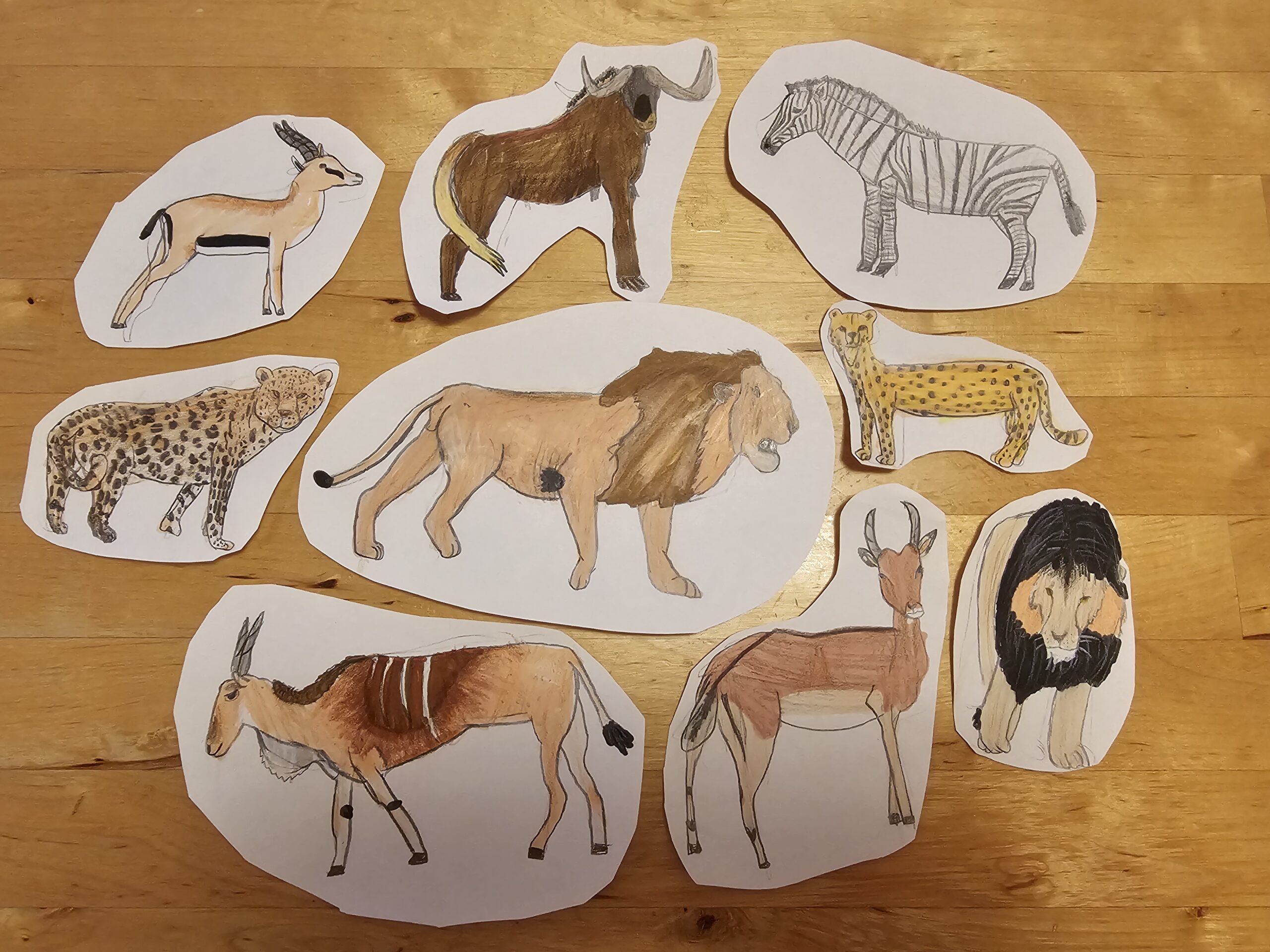 Sofia on tässä viimeisen viikon aikana innostunut piirtämään mallista afrikan eläimiä. Tällä kertaa kuvissa on muitakin kuin kissaeläimiä, koska hän on yleensä minulta kysynyt mitä piirtää. Ajattelin että erilaisia antilooppeja kannattaa piirrellä, koska mallista niitä piiräessä, hän tulee samalla ehkä hvainneeksi eläinten tuntomerkkejä. Ei sitten olla ihan oppaan armoilla sen suhteen, mitä eläimiä tunnistetaan ja mitä ei.